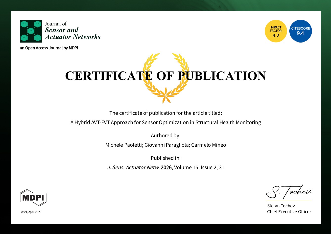 1. โ†‘ [1] (2026). Paoletti, M.; Paragliola, G.; Mineo, C. A Hybrid AVT-FVT Approach for Sensor Optimization in Structural Health Monitoring. J. Sens. Actuator Netw. 2026, 15, 31. https://doi.org/10.3390/jsan15020031.