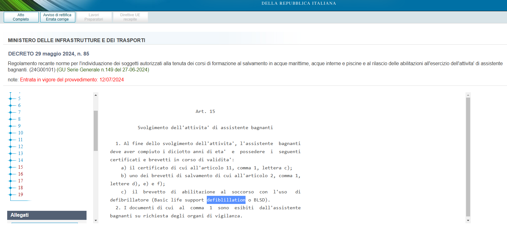 [1] DECRETO 29 maggio 2024, n. 85 – Regolamento recante norme per l’individuazione dei soggetti autorizzati alla tenuta dei corsi di formazione al salvamento in acque marittime, acque interne e piscine e al rilascio delle abilitazioni all’esercizio dell’attivita’ di assistente bagnanti. (24G00101) (GU Serie Generale n.149 del 27-06-2024)